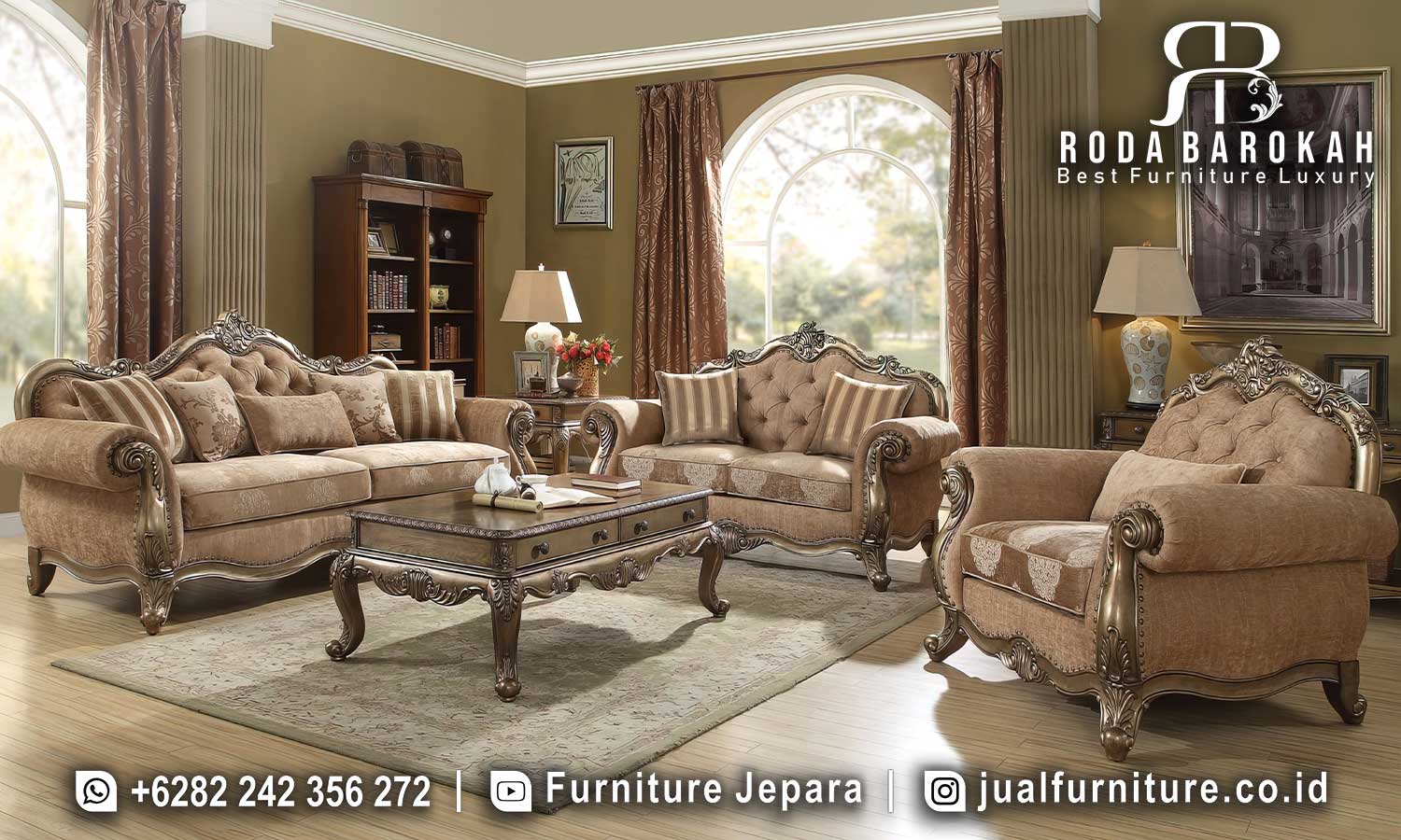 Sofa ini memiliki ornamen ukiran yang indah, memberikan detail artistik yang unik. Selain itu, sandaran tangan yang ergonomis mendukung kenyamanan saat bersantai. Kemewahan sofa ini juga terlihat dari kombinasi warna coklat gold yang menawan, menjadikannya pilihan sempurna untuk gaya dekorasi klasik maupun modern minimalis. Oleh karena itu, bayangkan betapa indahnya ruangan Anda dengan kehadiran produk ini.