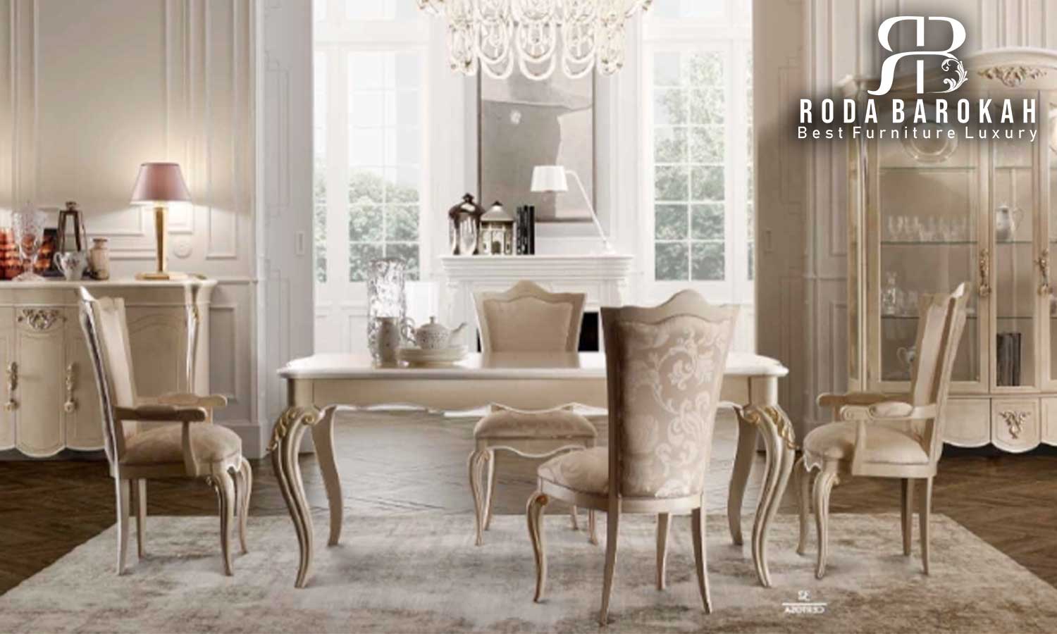 - Set Ruang Makan Mewah ini menawarkan desain klasik yang timeless dan mampu menambah keanggunan di dalam ruangan Anda.
