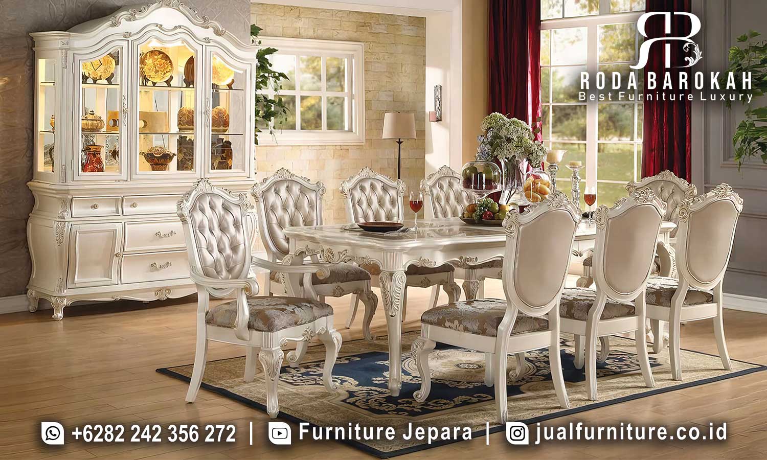 Meja makan ini menawarkan set lengkap yang terdiri dari satu meja persegi panjang dan enam kursi, seluruhnya dirancang dengan detail yang menawan. Kaki kayu ukir yang kokoh tidak hanya menjamin stabilitas, tetapi juga mempertegas gaya Klasik Eropa yang diusung. Dengan demikian, Model Meja Makan Mewah ini tidak hanya berfungsi sebagai tempat menyantap hidangan, namun juga sebagai elemen dekoratif yang memberi kesan hangat dan menyenangkan bagi keluarga dan tamu Anda.