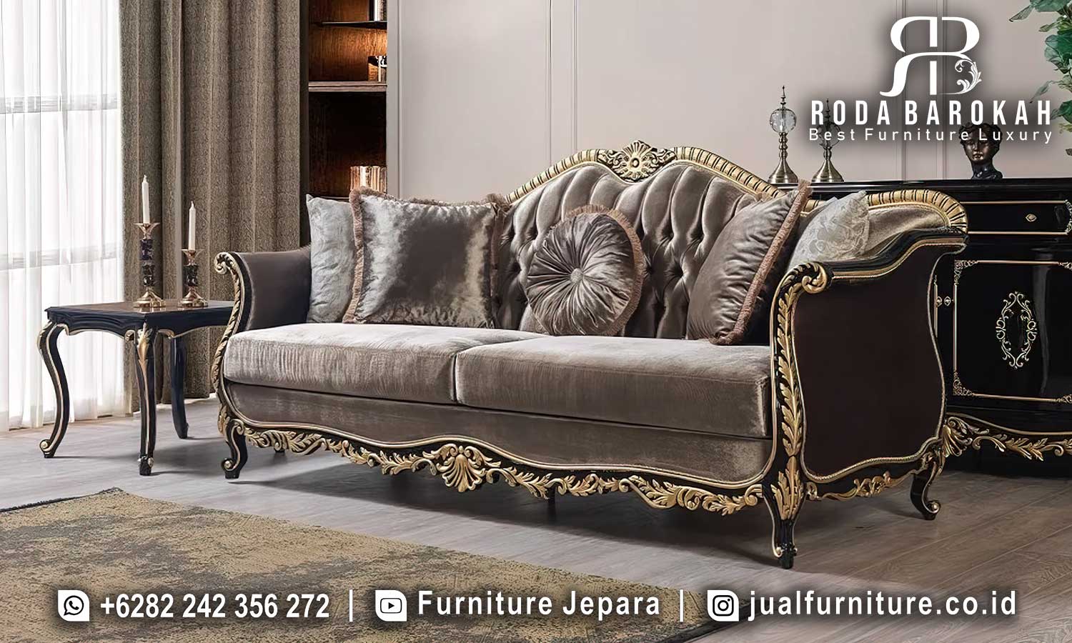 Model Sofa Tamu Mewah Sovrano Desain Prestisius FS1030 adalah pilihan sempurna untuk menghadirkan sentuhan elegan dalam ruang tamu Anda. Seluruh rangka terbuat dari kayu jati yang kuat, memberikan daya tahan yang luar biasa sekaligus memancarkan kesan klasik yang mewah. Finishing emas pada bagian kaki dan detail jahitan menciptakan harmoni yang indah, menjadikannya salah satu Model Sofa Tamu Mewah yang paling diminati saat ini. Dengan segala keindahan dan kualitas ini, sofa ini tidak hanya berfungsi sebagai tempat duduk, tetapi juga sebagai elemen dekoratif yang bernilai tinggi.
