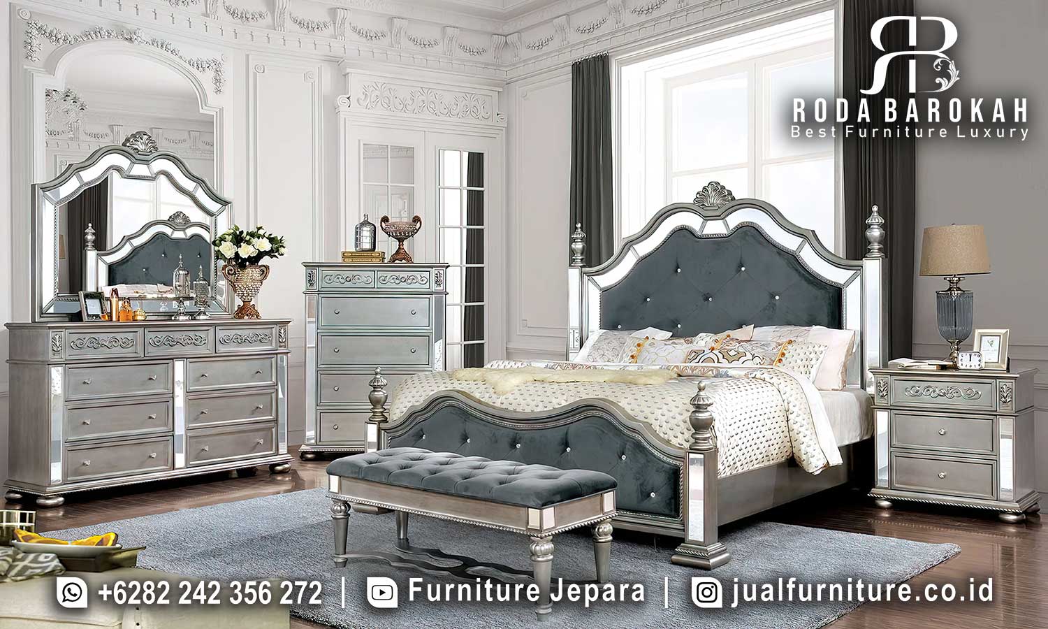 Model Tempat Tidur Minimalis Mewah Versailles Bernuansa Antik FS1012 adalah pilihan tepat bagi Anda yang mendambakan keanggunan dalam kamar tidur. Diproduksi dari kayu jati berkualitas tinggi, produk ini menawarkan daya tahan dan keindahan yang sulit ditandingi. Dengan sentuhan kain bludru yang lembut dan nuansa warna abu-abu serta putih, tempat tidur ini tidak hanya sebagai furnitur, tetapi juga sebagai elemen dekoratif yang menawan. Selanjutnya, Anda tidak perlu khawatir soal fungsionalitas, sebab desain ini dilengkapi dengan meja rias dan lampu yang membuatnya menjadi solusi pamungkas untuk ruang tidur yang elegan.