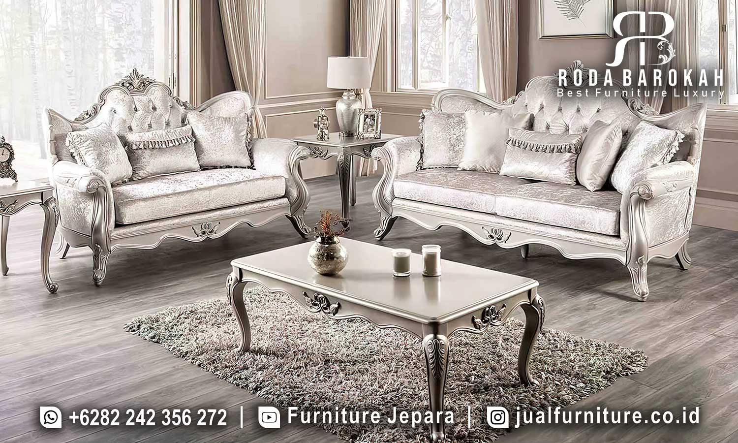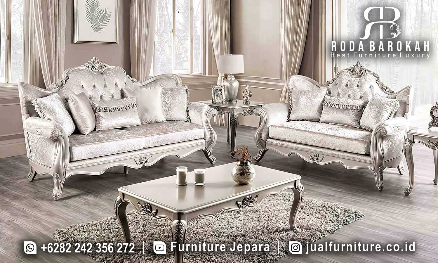 Bayangkan ruang tamu Anda yang dipenuhi pesona dengan kehadiran sofa ini. Kombinasi warna putih silver yang elegan dapat menyatu dengan berbagai tema dekorasi, terutama dalam gaya minimalis modern dan klasik. Oleh karena itu, sofa tamu ini tidak hanya menjadi focal point, tetapi juga menciptakan nuansa harmonis yang menyenangkan. Sekali lagi, ornamen ukiran yang indah pada kaki meja dan kursi menambahkan sentuhan artistik yang dijamin mampu menarik perhatian setiap tamu yang datang.